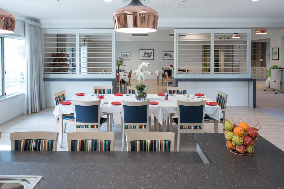 Built in 1997 and four developments later, our aged care home offers all single occupancy rooms with ensuites with four sizes of rooms on offer – 24, 26, 28 and four 42 square metre rooms (the latter have a separate lounge area). All rooms have access to outside spaces. Kaloma is located next to the golf course and has a pleasant rural feel with lots of open spaces and bountiful gardens.